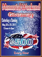 Saturday & Sunday May 28 & 29, 2011 Drawing Times: 12 Noon to 8 p.m. $500 Every Hour